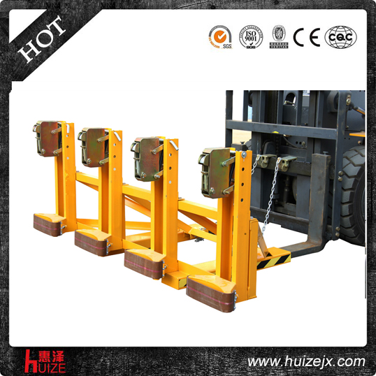 重型四油桶夾單鷹嘴DG2000A純機(jī)械機(jī)構(gòu)設(shè)計可與叉車方便地配合,僅依靠叉車的動作,不需要其它的動力,可自動一次搬運(yùn)4個鋼制油桶,  配置可拆換式柔性耐磨保護(hù)墊,有效保護(hù)油桶并緩沖叉車行駛過程中的震動, 能在集裝箱等這樣狹小的環(huán)境內(nèi)裝卸桶裝物質(zhì),可極大地提高空間利用率, 與貨叉連接配有自鎖裝置確保油桶夾在坡度上和顛簸路面使用時不會滑落.